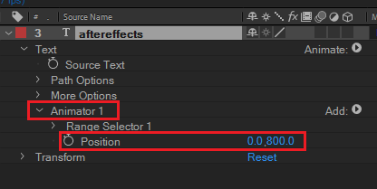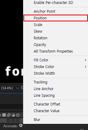 애니메이터의 포지션 값을 조정해보면 텍스트에 아무런 움직이 없는데, 글자에는 힘이 가해져 있는 상태입니다.