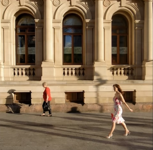 두 여성이 걷고 있습니다. 그럼데 걷는 모습이 아주 대조적입니다.