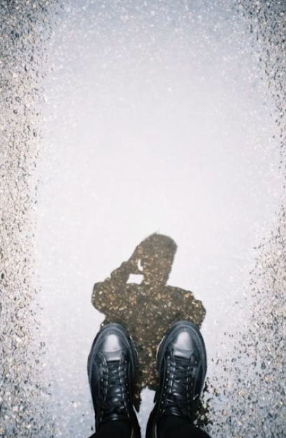 이 사진은 여성이 땅을 보고 걷고 있는데 반대편에서는 한 남자의 그림자가 걸어옵니다.