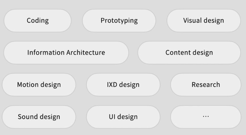 굳이 나열을 하자면 Cording, Prototyping, Visual design, Information Architecture, Content dedsign, Motion Design, IXD design, Research, Sound design, UI design ... 등이 있을거에요. 그리고 이 외에도 더 많은 관련된 역량을 필요로 할 겁니다.