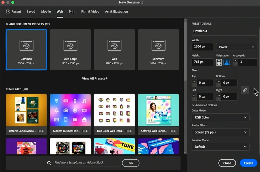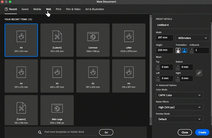 다시 일러스트로 돌아가서 보면, 컬러모드는 CMYK모드로 되어 있고 단위는 Millimeters로 설정되어 있고 해상도도 300으로 설정되어 있는 것을 볼 수 있습니다. 그리고 웹용을 눌러보면 컬러모드는 RGB, 단위는 Pixels, 해상도는 72로 설정되어 있는것을 볼 수 있습니다. 그래서 이렇게 웹용과 인쇄용을 목적에 따라 잘 구분해서 사용하시면 되겠습니다.