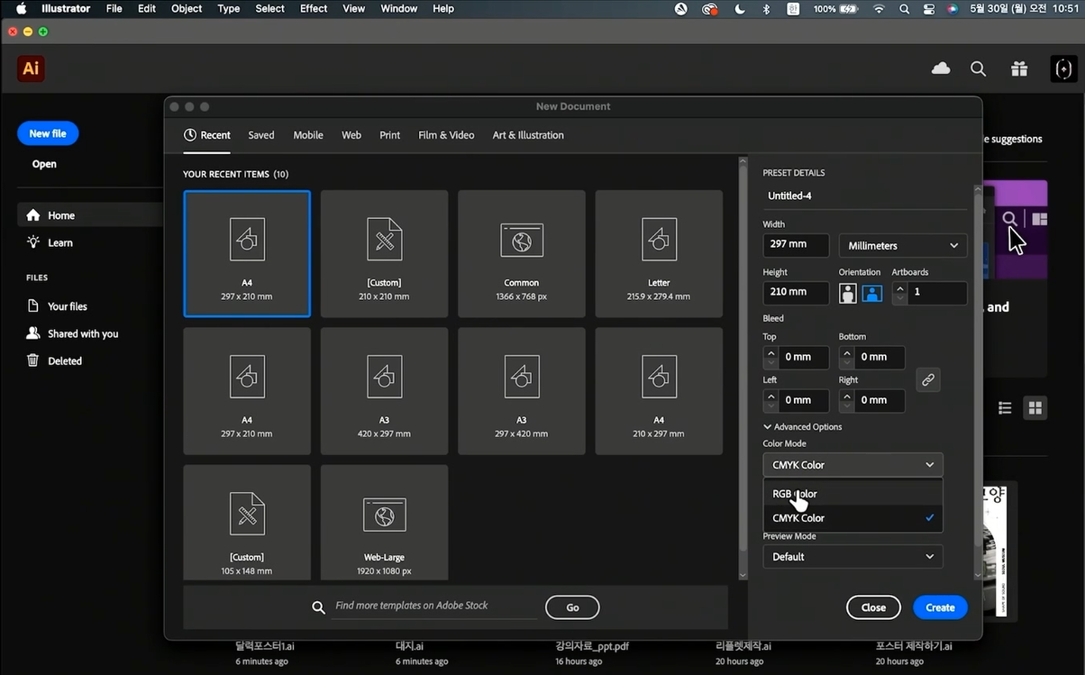 일러스트를 실행하고 New File을 눌러보면 오른쪽 밑에 컬러모드가 있고 기본적으로는 CMYK color라고 되어 있습니다. 이것을 눌러보면 RGB color와 CMYK color 이렇게 두 가지가 있습니다.