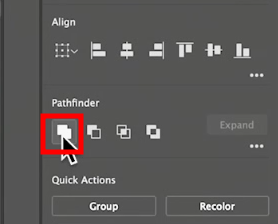 이 역삼각형의 윗면은 불필요한 선이니까 원형과 역삼각형을 합쳐보도록 하겠습니다. 합칠려면 패쓰파인더 기능을 사용해야 하는데요. 패스파인더는 면을 다양하게 나누거나 합칠 수 있는 기능이에요. 두 오브젝트를 클릭 후 패스파인더에서 합치는 기능(Click to Unite)를 눌러보겠습니다. 그러면 두 오브젝트가 하나로 합쳐지게 됩니다.