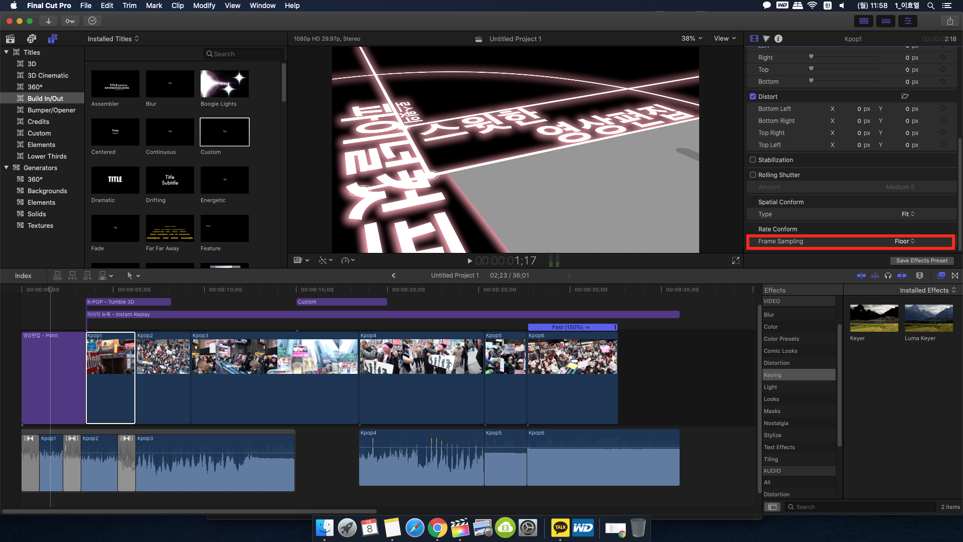 우리가 파이널 컷에 있는 레이트컨펌(Rate conform)과 프레임샘플링(Frame sampling)을 조절 할 수 있다.